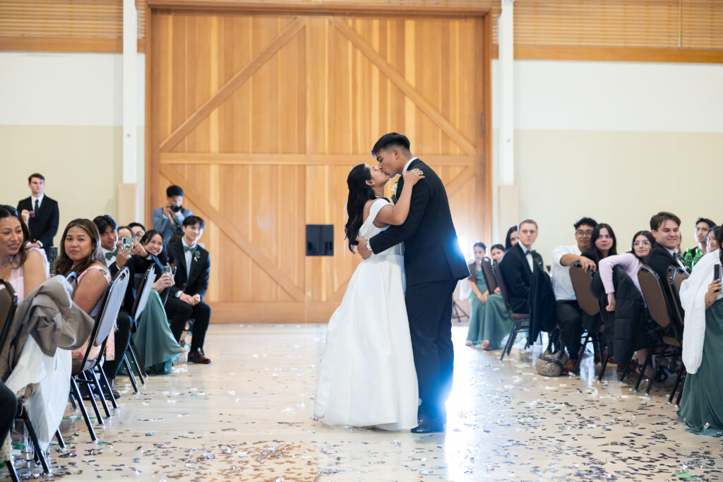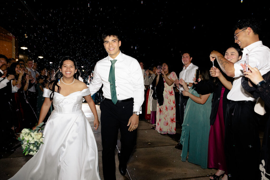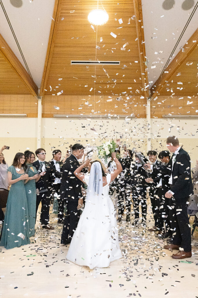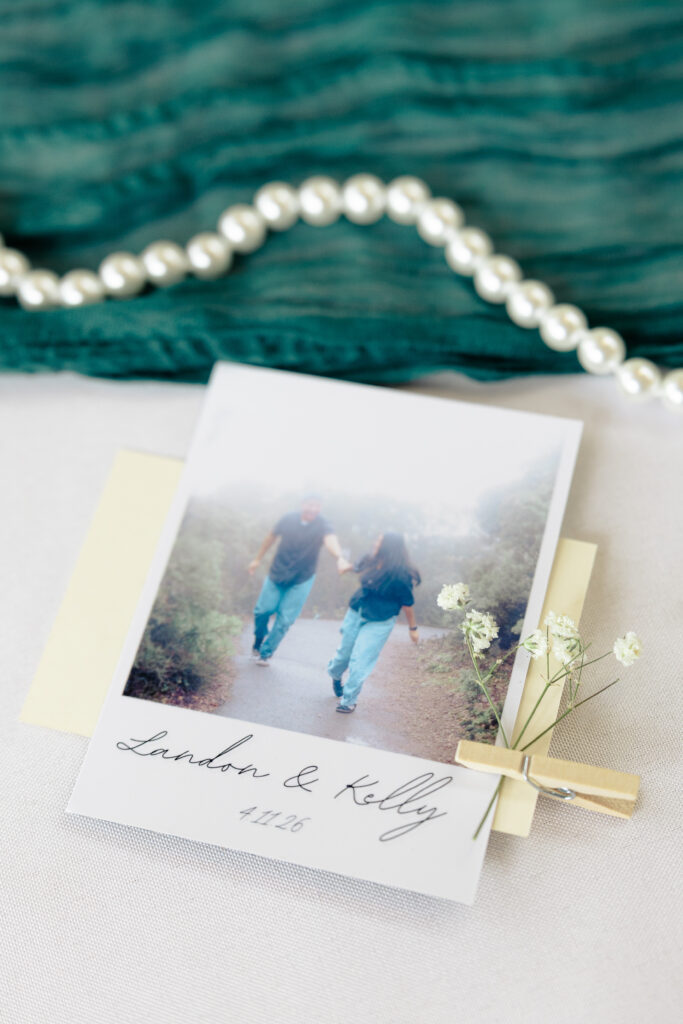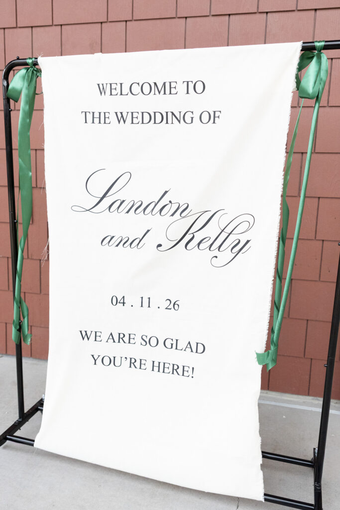 Rain or shine, Kelly & Landon were getting married! The date may not have been engraved yet in the rings, but everyone was coming, and they would leave officially as husband and wife. While a lot of plans changed, what was most important to them was saying their vows in front of their family and friends – something that could happen despite the weather. Thankfully the rain stopped long enough to run to a park and grab just a few pictures outside before it began pouring again! Now they’re off doing what they love to do, exploring nature together! See if you can guess where they’re headed by a custom decor piece they had displayed at their wedding…